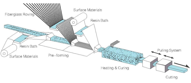 Pultrusion is a process for manufacturing pultruded prcducts by pulling continuous roving, fabric or mat through a resin impregnation bath,a shaping section where the resin is heated & cured and cut into specified lengths or further processed.